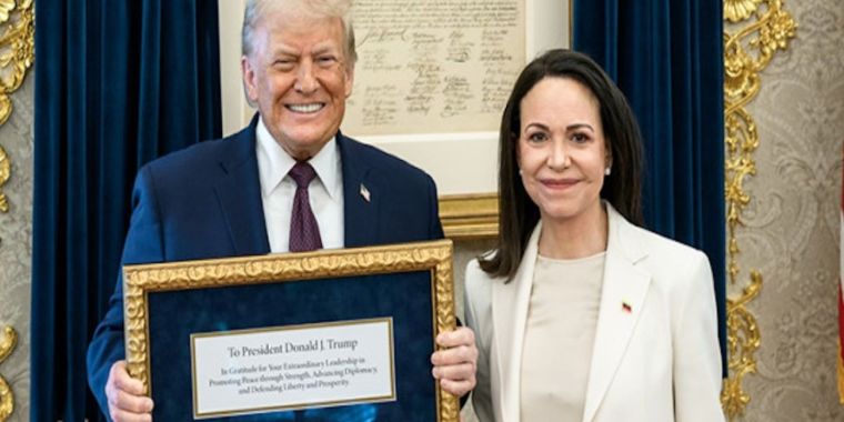 «Для меня было огромной честью встретиться сегодня с Марией Кориной Мачадо из Венесуэлы. Она замечательная женщина, которая многое пережила. Мария вручила мне Нобелевскую премию мира за мою работу. Это был прекрасный жест взаимного уважения», — написал Трамп.